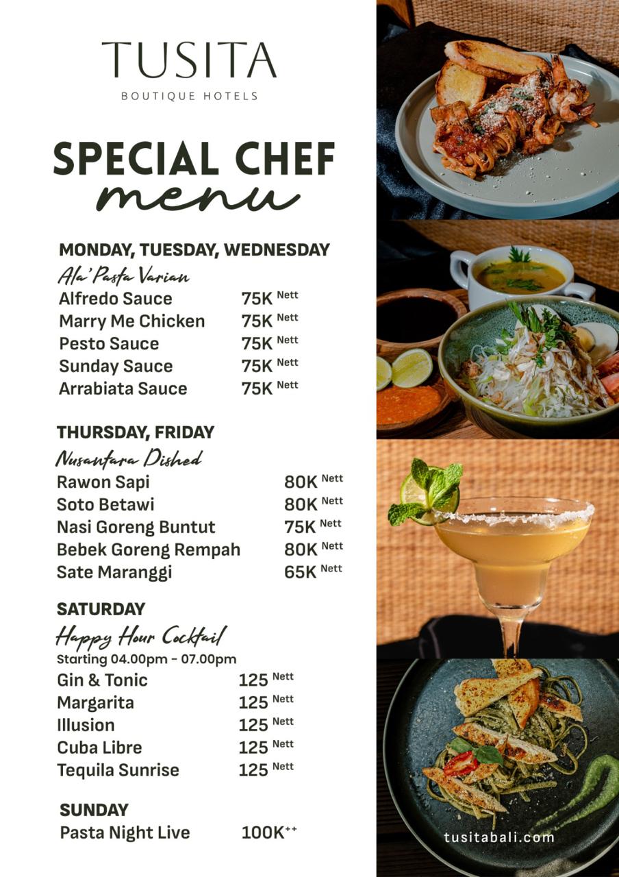 Indulge in a delightful culinary experience with our Special Chef Menu, featuring a variety of delicious dishes every day of the week!